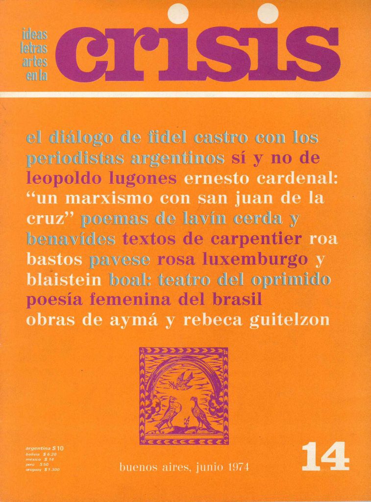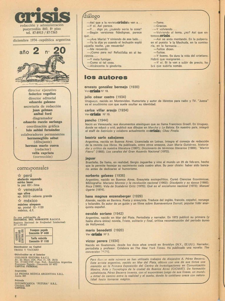 -Lo que queda en la memoria colectiva, creo que son aquellos cuarenta números iniciales, dónde Crisis fue el símbolo de una cultura que quiso ser comunicación practicada, no teorizada. Una revista muy bien definida por Aníbal Ford cuando dijo: nosotros queremos conversar con la gente. Era una publicación que quería conversar con la gente y lo logró. Rompimos una tradición de aislamiento de las publicaciones culturales que habían funcionado con mayor o menor éxito según los casos, pero dentro de lo que podríamos llamar una especie de ghetto cultural. Crisis fue una tentativa de salir de ese ghetto, a partir de la certeza de que las democracias en América Latina no van a ser del todo democracias hasta que el derecho de creación y de opinión, no sean de veras universales. Creo que hay dictaduras secretas en estos países nuestros, aunque la gente pueda ahora votar cada cuatro o cinco años. Son las que ejercen la economía y una estructura social que funciona para una minoría pero que en la práctica niega los derechos de las mayorías. Y uno de esos derechos negados, es el de creación y opinión.