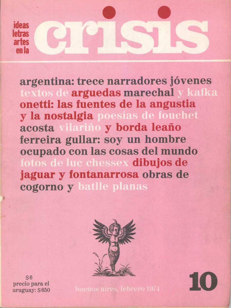 -Pienso que llegó a tener influencia, si. Cuando Fico me habló, la primera vez, como venía pensando la revista el equipo anterior, me dio la impresión que era una correa de transmisión de las novedades de la cultura europea que llegaban al Río de la Plata con demora. Como que se proponía actualizarnos en relación con las imágenes y los sonidos de los grandes centros generadores de cultura, el europeo y el norteamericano. Nosotros hicimos una revista radicalmente diferente que no se encerró en la cosa provinciana, en sus verdades de aldea. Por el contrario estuvo siempre muy abierta a los vientos de cultura que soplaban en el mundo. No sólo a los de las metrópolis consagradas si no también a otros que por estas costas ni se sabía que existían. Recuerdo los números que Crisis dedicó a la cultura africana. Debe haber sido la primera vez que una revista cultural en lengua española se ocupaba de un tema así. Resultó sorprendente para más de un lector el descubrimiento de voces africanas que tenían cosas para decirnos. Cosas que valía la pena escuchar. Sobre todo la preocupación nuestra fue la difusión de la cultura argentina y latinoamericana. Aquel proyecto inicial de una revista como vehículo de información de lo que ocurría en Paris o en Nueva York cambió mucho. Se convirtió en otra cosa. Desde el primer número hubo una actitud de afirmación de lo nuestro. No a partir de una ceguera arrogante, sino de la certeza de que cultura es comunicación y para que ella exista debe ser una comunicación entre iguales, lo cual implica una relación de respeto mutuo. Uno de los problemas básicos de la cultura latinoamericana es una suerte de complejo de inferioridad. Y es necesario partir de un autorrespeto que implica autoconocimiento. Uno no puede respetarse si no se conoce. Estamos entrenados para desquerernos e ignorarnos. La revista quiso ser desde el principio un vehículo de cultura entendida como un acto de amor y como afirmación de dignidad. Un acto de amor y una afirmación de dignidad.
