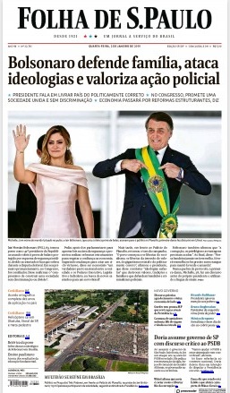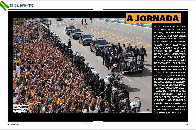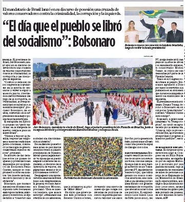 “Me presento ante la nación este día en que el pueblo empezó a liberarse del socialismo”, afirmó Jair Bolsonaro cuando promediaba su primer discurso como presidente, ante sus seguidores reunidos en Brasilia. “¡Nuestra bandera jamás será roja!”, vociferó al tomar posesión como 38° mandatario de la República federal de Brasil, en una ciudad militarizada. Para agregar: “Sólo será roja si precisamos derramar nuestra sangre para mantenerla verde y amarilla”. Redundante en su retórica de campaña, el ex capitán, volvió a mostrar la orfandad de ideas y propuestas ante los gravísimos problemas que atraviesan al gigante suramericano.