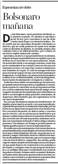 Ahora mesianismo y ataque frontal contra las mayorías: Que los niños vistan de azul y las niñas de rosa, mientras se excluye a la población LGTB de las políticas de derechos humanos. Que hace treinta años que gobierna el comunismo y es imprescindible batallar contra el marxismo cultural. Que hay que privatizar todo y echar a los petistas para devolver la confianza de los inversores y atraer recursos privados. Mientras se rebaja el salario mínimo ya fijado a 998 reales. Las reservas indígenas, fundamentalmente amazónicas, pasando a manos de terratenientes y ejecutivos del agronegocio enquistados en el ministerio de Agricultura. Que es necesario proteger el accionar policial y promover el derecho a la legítima defensa de la población. Que vamos a quitar el sesgo ideológico de las relaciones internacionales, mientras se edifica la Santa Alianza del siglo XXI con Estados Unidos e Israel. Que “Brasil por encima de todo y Dios por encima de todos”.