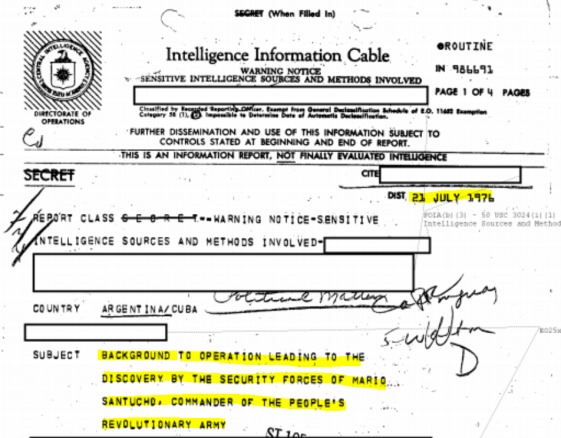 El 12 de abril, la Casa Blanca anunció la desclasificación de una nueva tanda de documentos sobre Argentina(1). Entre esa masa enorme y bastante desordenada de archivos, encontré un cable que se refiere a la caída de Mario Roberto Santucho, máximo líder del PRT-ERP(2). Como quizá muchos/as sepan, la caída de Santucho y toda la cúpula del PRT es aún hoy objeto de controversias. Todavía no está claro cómo llegaron los militares al departamento de Villa Martelli, donde se ocultaba el hombre más buscado por la dictadura, justo un día antes de su partida al exilio.