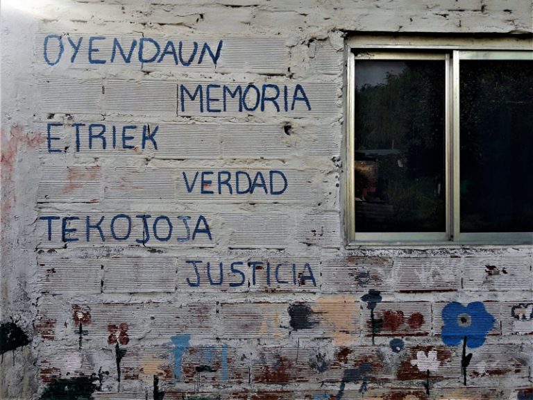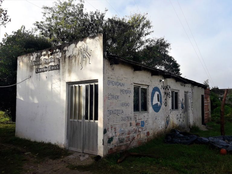 Este principio comunitario tiene que ver con la identidad originaria: “Nos sentimos parte y nos identificamos como charrúas”, afirma Laura. «Esto viene de la mano de Rosita Albariño –investigadora que reivindicó a los pueblos originarios de la provincia-. Lo que decimos es que no es solamente la identidad netamente de sangre, sino un sentido de pertenencia y de cultura: esto de que haya un salón abierto para toda la ciudadanía es algo que nos han dejado de su cultura. Más allá que por ahí los rasgos que te pide el común de la sociedad son la pluma en la cabeza y el taparrabo, nosotros seguimos fortaleciendo nuestra identidad en estas tradiciones de pensar las proyecciones en conjunto y no solo para algunos pocos». El principio charrúa es que todos son todo y se ayudan en todo. De hecho, etriek significa “verdad”; la traducción literal sería Escuela Popular Verdad Charrúa. “Se podría significar verdad charrúa como una intención de contar nuestra versión de las cosas”, aclara Laura. Uno de los muros tiene escrita las palabras: oyendaun, etriek, tekojoja, que en castellano quiere decir: memoria, verdad, justicia. Sobre la puerta de ingreso está pintada una inscripción que llaman «el bailarín» que, según la leyenda, es una imagen que se forma de las chispas que desprenden los fogones de celebración.