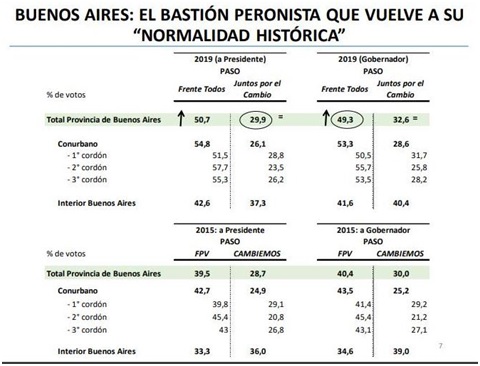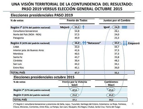 El informe se regodea con cuadros estadísticos rotundos. El primero de ellos, contra la especulación de Clarín que intenta trasvasar votos y agregar votantes que no participaron, remarca que “Aún en un hipotético y extremo caso favorable para el oficialismo, no llega”. El siguiente expresa “la contundencia del resultado”, comparando las PASO actuales con las de 2015.