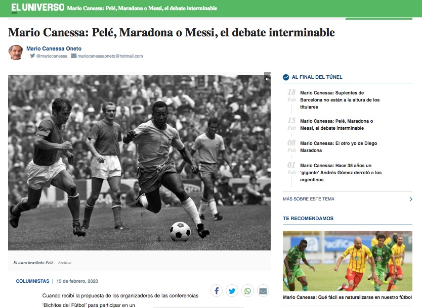 La décima edición de los premios Bichito del Fútbol organizada por Claro Ecuador a comienzo del mes en curso incluyó un animado debate, moderado ponderadamente por Diego Arcos, sobre quien debe ser considerado como el mejor futbolista de la historia. El mismo acaparó la atención del evento. Los candidatos para tal reconocimiento eran tres: Pelé, Diego Maradona y Lionel Messi. En la versión del debate en Guayaquil, éstos fueron propuestos respectivamente por los periodistas Mario Canessa Oneto, Alfonso Harb y Jorge Barraza.