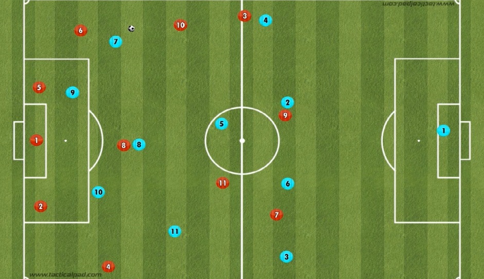 El objetivo cada vez que se reanuda el juego y disponemos del balón es poder avanzar en el campo con el pase como herramienta para desordenar defensivamente al rival, que siempre aprovecha la detención del encuentro para reagruparse. Para lograr eso, resulta fundamental disponer de una estructura posicional que nos permita encontrar zonas con superioridad numérica para que los jugadores puedan resolver las situaciones con más tiempo. La búsqueda en todas las circunstancias es generarles a los futbolistas un contexto favorable para que tomen las mejores decisiones.