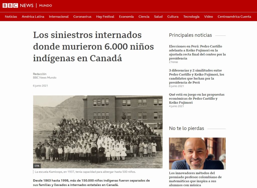 Es poco común que una noticia canadiense llegue a la Argentina, pero desde principios de junio de 2021, aparecieron reportajes múltiples en la prensa nacional, y en decenas de países más, sobre el hallazgo de los restos de 215 niños indígenas en Kamloops, Columbia Británica. El Consejo de los Derechos Humanos de las Naciones Unidas pidió al gobierno canadiense que investigue este horror y los demás casos de las miles de víctimas de las escuelas residenciales.