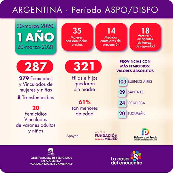 Un dato relevante es que de las víctimas, 160 habían realizado denuncias, 107 femicidas tenían medidas cautelares dispuestas y 90 de los asesinos eran agentes o ex agentes de las fuerzas de seguridad. Por otra parte, el informe muestra que 472 casos fueron en las viviendas de las víctimas y 451 fueron en viviendas compartidas con el femicida.