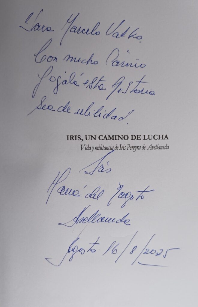 En mi reciente visita a Los Polvorines organizada por la Mesa de Sobrevivientes por la Memoria de Campo de Mayo y Cultura y DDHH de Malvinas Argentinas, tuve el honor que, entre tantos compañeros que se dieron cita, Iris Avellaneda me dedicara un ejemplar de “Iris, un camino de lucha” escrito por Pablo Moren sobre su vida y militancia por una Patria Grande y Justa publicado por Editorial Cartago y Bitácora Ediciones.